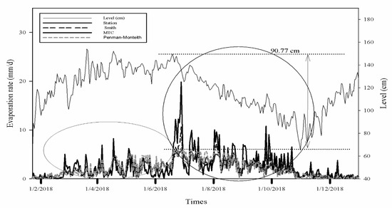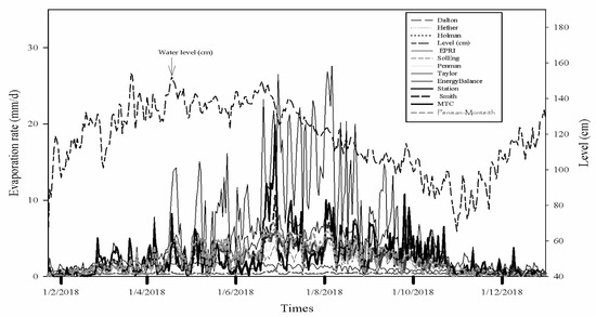 - Mosner, M.S.; Aulenbach, B.T. Comparison of methods used to estimate lake evaporation for a water budget of Lake of estimation methods. Hydrol. Process. 1998, 12, 429–442. [Google Scholar]