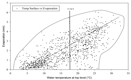 - The evaporation rates differ for the same water temperature and depending on the air temperature and, more precisely, the season. Thus, depending on whether the season is cold or warm, the same temperature is experiences different evaporation rates. The thermal energy stored in the mass is directly responsible for this effect giving rise to hysteresis. As shown Figure 12, the graphical representation of air temperatures and ET indicates that for the lowest temperatures and at the beginning of the energy stock reconstitution, the thermal amplitude is high for the same evaporation value. At an average temperature of 17.5 °C, the evaporation gap can vary from 1 to 6 mm.