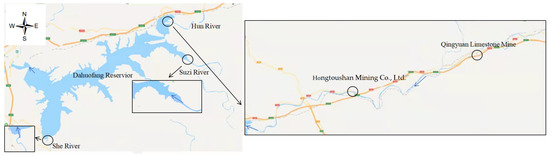 Dahuofang Reservoir is the main drinking water source of Shenyang, Fushun, Anshan, Liaoyang, Yingkou, Panjin, and other cities in central Liaoning Province. The Hun River, Suzi River, and She River in the upstream of the reservoir are the main water sources of the reservoir, accounting for 52.7%, 37.1%, and 10.2%, respectively [16]. The geographical location of the reservoir and upstream basin is shown in Figure 1. The Hun River basin above the Dahuofang dam site is 169 km and controls a basin area of 2752 km2, which is the river with the largest amount of water entering the Dahuofang Reservoir, and the presence of chemical mines such as Qingyuan Limestone Mine and Fushun Hongtushan Mining Company (Fushun, China) Limited in the Hun River basin increases the possibility of sudden water pollution accidents. Therefore, it is of great significance to establish a hydrodynamic water quality model in Hunhe River basin and analyze the variation law of pollutant concentration when sudden water pollution accidents occur, so as to ensure the safety of the water supply in Dahuofang Reservoir. The depth of the Hunhe River in the research section is less than ten meters, which is surface water and can be studied with a two-dimensional mathematical model.