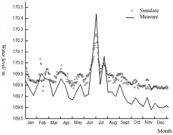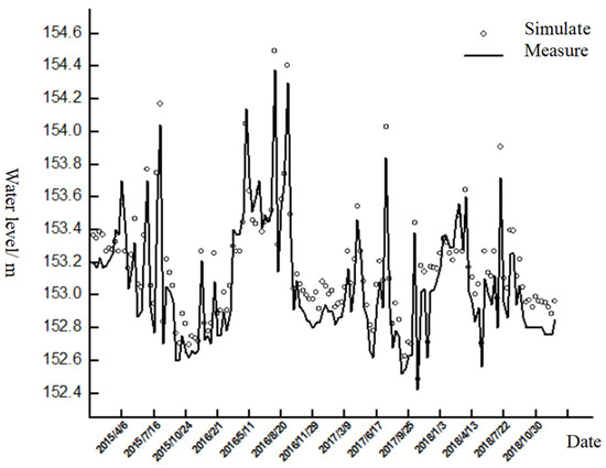 The hydrodynamic model was validated based on the measured water level data from Beikouqian hydrological station (2014) and Cangshi hydrological station (2015–2018) (Before 2014, it was Beikouqian hydrological station, and later moved to Cangshi hydrological station). The simulated water level and measured water level of Beikouqian hydrological station (2014) are shown in Figure 3. The average absolute error was 0.144 m and the average relative error was 0.085%, of which the maximum absolute error was 0.192 m and the maximum relative error was 0.113%.The simulated water level of Cangshi hydrological station (2015–2018) and the actual measured water level were shown in Figure 4, with the average absolute error of 0.096 m and the average relative error of 0.063%, of which the maximum absolute error was 0.198 m and the maximum relative error was 0.129%. It can be seen that the calibration result was good and can be simulated.