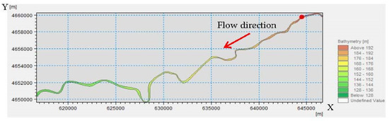 According to the simulation range of this model, the upstream boundary of the model was determined to be 1600 m upstream of Qingyuan Limestone Mine, and the daily average flow from 1 January 2014 to 31 December 2018 was used as the flow boundary, while the downstream boundary was Beizamu Bridge, and the average flow was used as the water level boundary.