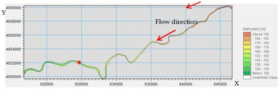 The initial conditions of the hydrodynamic model include initial water level and initial velocity, which can be set to ensure the smooth start of the model. For this model, the initial water level of the model was set to the lowest water level value of 137.62 m at the downstream boundary, and the initial flow velocity was zero.