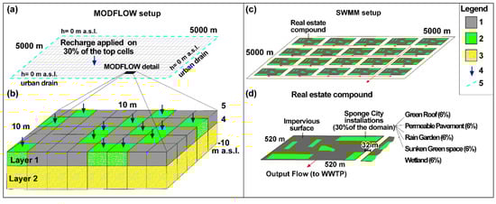 - Zhang, K.; Chui, T.F.M. Assessing the impact of spatial allocation of bioretention cells on shallow groundwater—An integrated surface-subsurface catchment-scale analysis with SWMM-MODFLOW. J. Hydrol. 2020, 586, 124910. [Google Scholar] [CrossRef]
