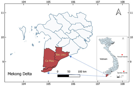 Study area in Bac Lieu and Ca Mau provinces, Vietnamese Mekong Delta.