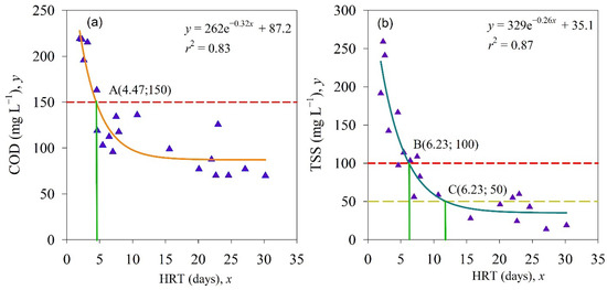 Figure 2 shows the outflow concentration of COD and TSS and its correlation with the HRT. It can be observed that both COD and TSS concentration noticeably varied between shrimp farms, from 69.80 to 219.13 mg L−1 and 13.75 to 259.00 mg L−1, respectively. In general, biological settling ponds were effective for eliminating both COD and TSS with prolonged HRT. This is explained well by the positive exponential correlation of COD and HRT (r2 = 0.83) (Figure 2a) and TSS and HRT (r2 = 0.87) (Figure 2b). Pertaining to the regression and permissive level of the QCVN 02-19:2014/BNNPTNT, COD and TSS outflow concentrations are required below 150 and 100 mg L−1, respectively. As such, the optimal HRT based on QCVN 02-19:2014/BNNPTNT to efficiently treat COD was calculated at 4.47 days, while to treat TSS, the estimation is 6.23 days. However, the TSS limitation in relation to BAP requires below 50 mg L−1; referring to Figure 2b, HRT is calculated by 13.40 days. HRT optimization was, therefore, recommended to be a minimum of 13.40 days to admit both QCVN 02-19:2014/BNNPTNT and BAP standards and guidelines. According to Formula (4), we estimated that the minimum SPA in order to eliminate pollutants practically from the wastewater of SI-SFs was 1947 m2 (inflow rate, 217.98 m3 ha−1 day−1; water depth, 1.50 m).