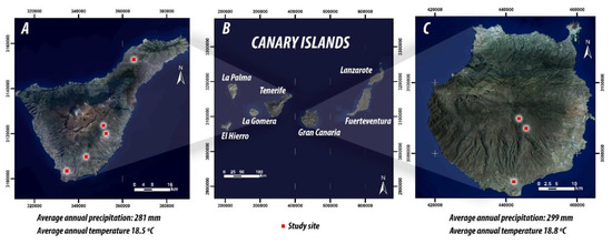 Map of the Canary Islands (B) with the location of the facilities studied in Tenerife (A) and Gran Canaria (C).