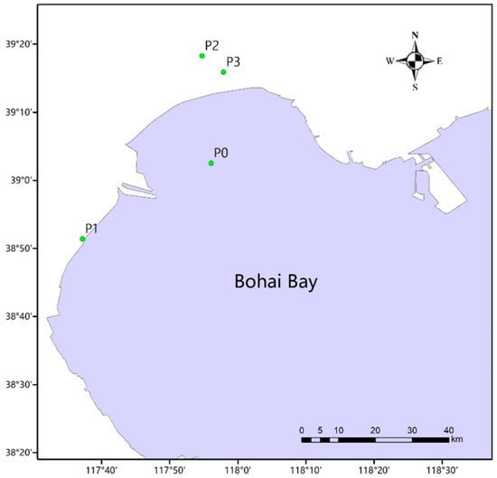 Map of the sampling location and sampling sites: The four sampling sites were P0 (117.935° E, 39.0415° N), P1 (117.626544° E, 38.852927° N), P2 (117.912634° E, 39.304451° N) and P3 (117.964958° E, 39.264878° N) in the west of the Bohai Sea, in northeast China.