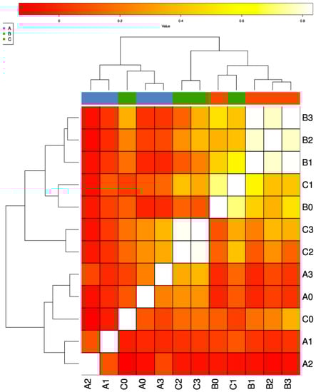 A comparative analysis was performed between samples from the gut of C. semilaevis (A0-A3), water (B0-B3) and soil (C0-C3) to evaluate the possibility of HGT between the different biomes. The correlation of ARGs detected from different samples showed a good cluster in the sample type (Figure 2), and samples from fish (A) were distinguished from water (B) and soil (C) (Adonis: p-value = 0.017; Anosim: p-value = 0.011). The results (Table S1 in Supplementary Materials) indicated that the average level of ARGs detected in fish samples was lower compared to the soil samples and the numbers of ARGs in soil samples were lower compared to the water samples. Relatively pristine environments (A0 and B0) revealed fewer ARGs than other fish farm (Table S1 in Supplementary Materials). Clustered A1 and A2 separated from A0; B1, 2 and 3 separated from B0 (Figure 2). The Venn diagram showing the distribution of ARGs among fish (A), water (B) and soil (C) samples was depicted (Figure 3). A total of 366 ARGs, all classes combined, was screened from the water samples, while 340 ARGs were screened from the soil samples and only 221 ARGs were obtained from the fish samples. Some individual ARGs followed this trend. For example, 62 ARGs encoding for resistances to aminoglycosides were found in water samples, while only 46 and 30 ARGs were recorded for the soil and fish samples, respectively. In addition, 10 ARGs encoding for resistance to chloramphenicol were obtained from water samples, while 6 and 1 from the soil and fish samples, respectively. The same trend was observed for ARGs encoding for tetracycline, as well as mobile genetic elements (MGEs). CIntI-1 (class1), IS613, Tp614, intI-1 (clinic), tnpA01, tnpA02, tnpA03, tnpA04, tnpA05 and tnpA07 were detected, and cIntI-1 (class1), intI-1 (clinic) tnpA04 and tnpA07 were the most common MGEs among the three sample types. Nevertheless, some disparities were observed. ARGs encoding for β-lactam, multidrug and sulfonamide were more abundant in soil samples than the water and fish samples, in this order. Additionally, the MLSB-associated ARGs were uniformly distributed in the water (32), soil (42) and fish (42) samples.