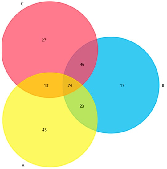 Venn diagram indicating the abundance of shared and dissimilar ARGs in the three types of samples: Three types of samples were fish samples (A), water samples (B) and soil samples (C). There were 366 ARGs in total, 74 of them shared in the three types of samples, 23 of them shared between fish samples and water samples, 46 of them shared between water samples and soil samples and 13 of them shared between fish samples and soil samples.