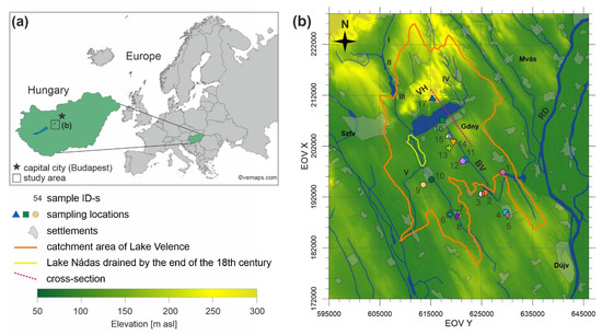 (a) The location of the study area. (b) Sampling locations. Main settlements: Szfv—Székesfehérvár; Gdny—Gárdony; Mvás—Martonvásárhely; Dújv—Dunaújváros. Surface water inflows to Lake Velence: I—Császárvíz; II—Zámoly reservoir; III—Pátka reservoir; IV—Vereb-Pázmánd watercourse; V—Dinnyés-Kajtor channel. Geographic features: VH—Velence Hills; BV—Bika Valley; RD—River Danube.