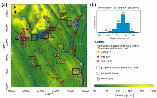 Majority of the wells in the study area were concentrated along the River Danube and in the catchment areas of the local settlements, while hilly areas had a limited number of wells with a much lower density (Figure 2a). Within wells, the vertical location of the screens also showed a skewed distribution (Figure 2b), most of them located between 50 and 100 m asl, and very few wells had screens either above 200 or below −150 m asl. These unequal data distributions limited the number of locations where p(z) profiles could be constructed and the number of elevation intervals for which potential maps could be generated.