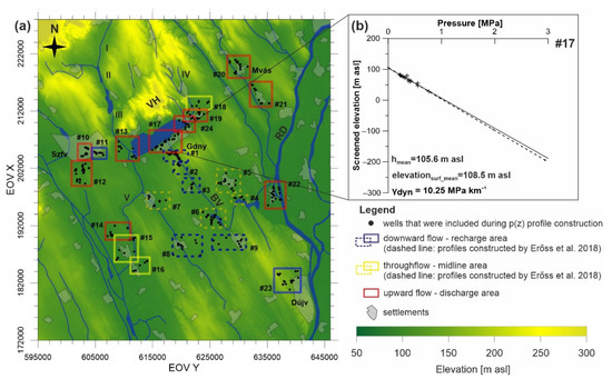After pore pressure was calculated for each well (using Equation (2)), pressure–elevation profiles were constructed to identify the vertical component of groundwater flow directions. On p(z) profiles, the vertical pressure gradient (γ), which is the change in pore pressure per unit vertical length in a flow domain, was compared to the ideal hydrostatic conditions. Ideally, under hydrostatic conditions there is no vertical fluid flow because the buoyancy and the force of gravity on water particles are in balance. In this case, the vertical pressure gradient was hydrostatic, and its average value was γst = 9.81 MPa km−1, assuming a constant water density of 1000 kg m−3. When the system was not hydrostatic (i.e., driving force exists), there was no balance between the buoyancy and the force of gravity; thus, there was a vertical flow component and the vertical pressure gradient changes to dynamic (dyn). In recharge areas γdyn < γst, meaning that there was a downward groundwater flow and γdyn was subhydrostatic, while in discharge areas γdyn > γst, thus there was an upward groundwater flow and γdyn was superhydrostatic. In midline areas, the vertical pressure gradient was hydrostatic (γdyn = γst); therefore, the fluid flow had no vertical component; nevertheless, the horizontal component could not be excluded [24].