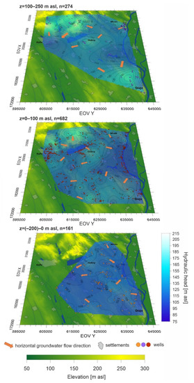 To examine the horizontal groundwater flow direction, tomographic fluid-potential maps were compiled for consecutive elevation intervals. These maps plot the calculated hydraulic head in the function of the geographical coordinates and present equipotential lines, along which hydraulic head values are constant. Groundwater flow lines are perpendicular to the equipotentials. A potential map can be constructed for one horizontal aquifer by original definition; however, in areas characterized by low data density, it is worth preparing potential maps for given elevation intervals. The elevation intervals for map construction were chosen based on the depth distribution of the data (Figure 2b) as the following: z = (−200)–0; 0–100 and 100–250 m asl. By comparing the so-called tomographic potential maps, which are constructed for successive elevation intervals, vertical flow directions could also be interpreted among them.