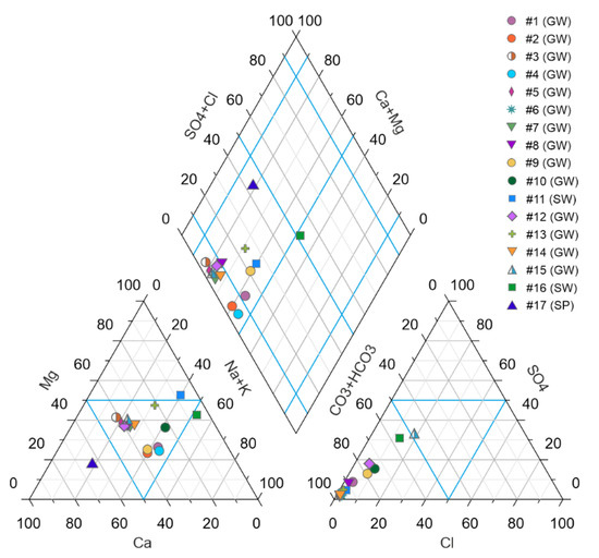 Since total dissolved solid content (TDS) of the water positively correlates with the EC value measured in the water, these four samples have the highest TDS among the collected samples (960–3238 mg L−1). Compared to the others, these four samples are characterized by anomalous chloride and sulfate concentration (up to 1000 mg L−1). In case of lake samples, these results can be related to the high rate of evapotranspiration. Evapotranspiration may also lead to the extremely high concentrations of other major ions in Lake Velence. The high dissolved solid content of groundwater sample nr. 13 is most likely related to the agricultural activity (i.e., using fertilizers and manure), which is also reflected by its high nitrate content (200 mg L−1). In case of sample nr. 9, the nitrate concentration is below the detection limit of 0.5 mg L−1, though the Na+, K+, and Ca2+ concentrations are relatively high and that may refer to natural causes (i.e., longer residence time of groundwater). In addition to these samples, spring water nr. 17 has a relatively high sulfate content as well (120 mg L−1). Since the spring is located in an urban area, there might be anthropogenic causes of the high sulfate content. Measured nitrate concentration of 44 mg L−1 can also indicate such effects. Rest of the groundwater samples have rather uniform water chemistry. Major ion concentrations (except in outliers nr. 9 and 13) are characterized by low relative standard deviation (0.19–0.69), among which SO42− shows the highest variation (0.69). Relative standard deviation values indicate low variation despite the wide elevation interval of −169–79 m asl from which samples were taken. Majority of groundwater samples belong to Ca–Na–HCO3–Cl–SO4 and Ca–Na–HCO3 water types and are characterized by no dominant cation and by the dominance of HCO3− anion (Figure 5).