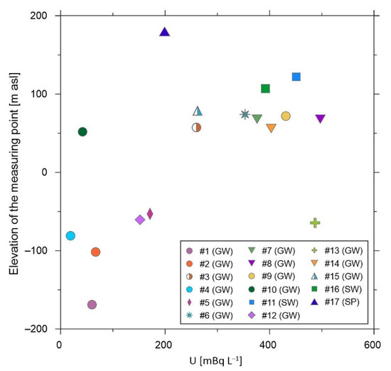 Measured ΣU activity concentration values plotted against the elevation of the measuring points (i.e., elevation of screening in wells or surface topography in case of lakes and springs).