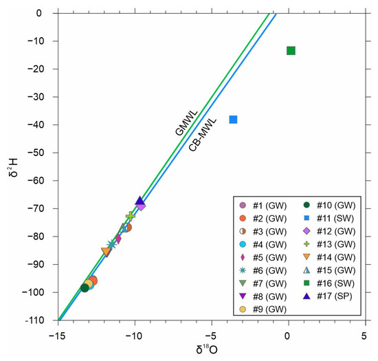 Stable isotopic composition of the collected water samples. GMWL: δ2H = 8 × δ18O + 10; CB-MWL: δ2H = 7.9 × δ18O + 3.9.