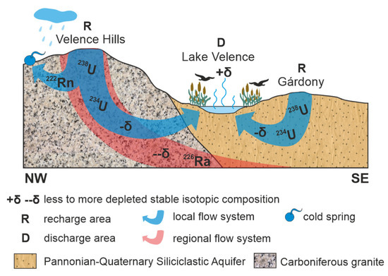 To refine the results of the hydraulic evaluation, δ2H and δ18O ratios were measured as an efficient method to distinguish water with different origins [15,16,17]. Radioactive isotopes of uranium (ΣU), radium (226Ra), and radon (222Rn) elements were also analyzed as common tools to identify the regime areas or the order of groundwater flow systems (e.g., [30,31,32]). The aforementioned radionuclides were chosen in line with the results of previous studies that revealed the existence of geogenic uranium contamination in groundwater in the southern foreland of Lake Velence [29,33,34].