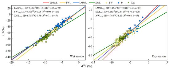 4.1. The Linear Regression Relationship of δD and δ18O in Rainfall, Soil Water, Xylem Water