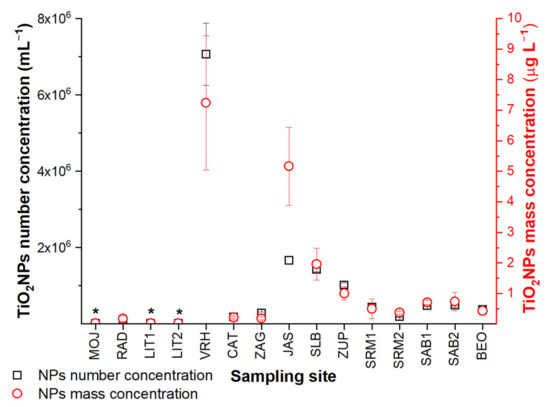 Mass and number concentration of TiO2NPs determined in water samples from 15 different locations of the Sava River. Data represent the mean ± STD of four replicates (N = 4). Asterisk (*) denotes sampling sites with TiO2NPs concentrations below LOQ.