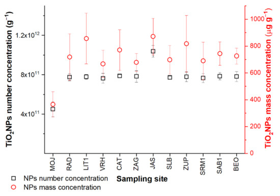 The mass and number concentration of TiO2NPs determined in the water samples of the Sava River are presented in Figure 2.