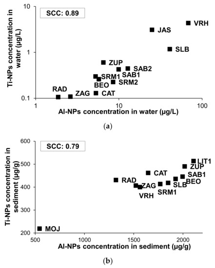 First, the correlation between the mass concentrations of Ti- and Al-containing NPs detected in water and sediment samples was evaluated (Figure 4).