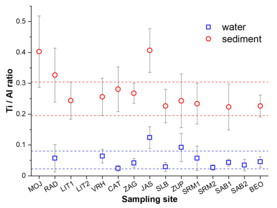Ti/Al ratios determined in NPs detected in water (blue squares) and sediment extracts (red circles), collected along the Sava River. Each data represents the mean ± STD of N replicates (N = 4 for water and N = 6 for sediment samples). The median value ± std for each sample type was calculated by considering all sampling sites, and its lower (median − std) and upper limit (median + std) are shown as dotted lines.