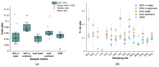 Ti/Al mass ratios determined in NPs in water, NPs in sediment extracts, bulk water, bulk sediment, and SPM: (a) Boxplots of Ti/Al values for each sample matrix determined by considering data from all sampling sites. Limits of the boxes and whiskers represent 25–75% percentiles and range within the 1st quartile, respectively, while the solid line and empty circle represent the median and mean ratios, respectively, observed within each sample matrix. (b) Ti/Al ratios of NPs in water, NPs in sediment extracts, bulk water, bulk sediment, and SPM at each sampling site. Each data represents the mean ± STD of N replicates (N = 4 for NPs in water, N = 6 for NPs in sediment samples, N = 4 for bulk water, N = 2 for bulk sediment and SPM).