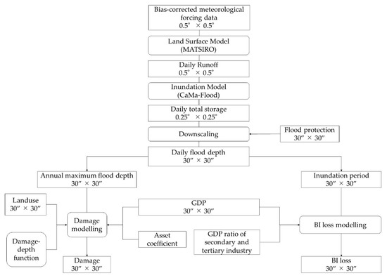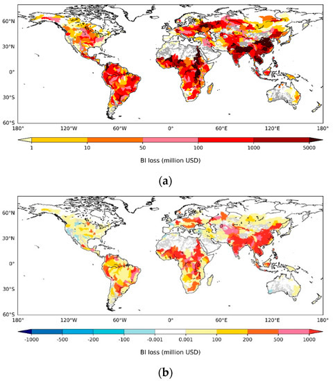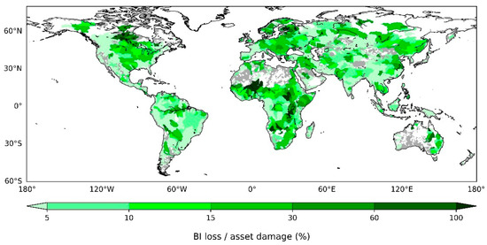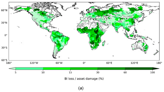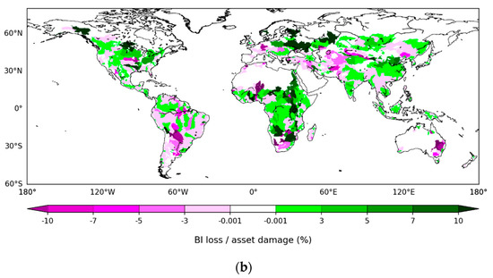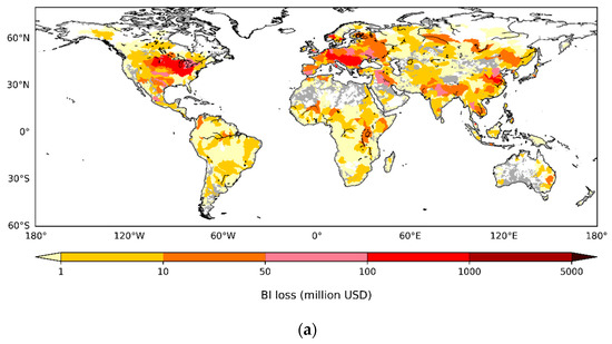 Previous global flood risk assessments have calculated population and GDP exposure estimates based on flood return periods. Hirabayashi et al. [1,2] projected that greater numbers of people will be affected by floods with return times of >100 years under a warmer climate. Ward et al. [15] estimated an annual GDP risk of USD 1383 billion (2005 PPP) by calculating flood hazard, exposure, and vulnerability on a global scale [16]; they overlaid GDP exposure and inundation depth hazard, then calculated the proportion of damage using a depth–damage function to represent vulnerability. A more realistic estimation of global flood risk was recently proposed, considering the level of flood protection required for each region [17]. However, these previous studies solely focused on asset damage [15,16,18], and model-based estimation of BI loss due to flood was limited to limited regions [19].