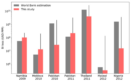 Comparison of simulated BI loss (red bars) with World Bank values (gray bars). Data are shown on a logarithmic scale; error bars indicate uncertainties related to the inclusion of BI loss data that do not consider flood protection.