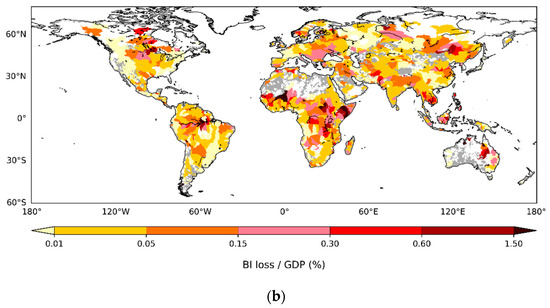 The spatial distribution of annual BI loss and BI loss per GDP averaged from 1960 to 2013 according to river basin drainage area (≥10,000 km2) are shown in Figure 3.