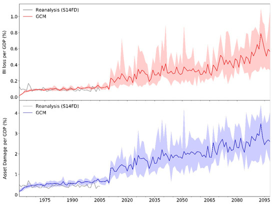 We compared changes in the percentage of BI loss to GDP over time with changes in asset damage relative to GDP according to S14FD-Reanalysis and S14FD-GCM data (Figure 4).