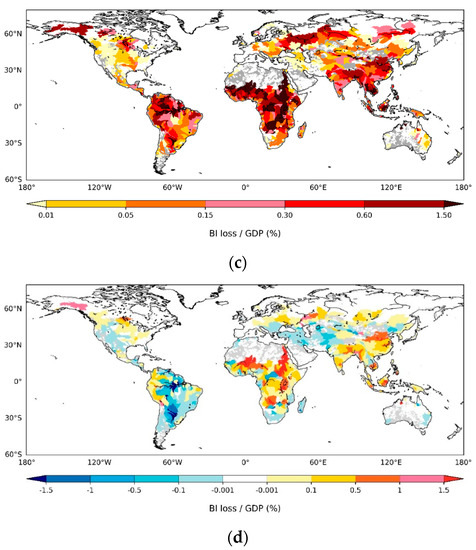 (a) Future BI loss (2061–2090). (b) Difference in BI loss between the future and past (1971–2000) study intervals. (c) Future percentage of BI loss relative to GDP. (d) Difference in the percentage of BI loss relative to GDP between future and past study intervals. Gray area indicates basins with area < 10,000 km2. White area indicates basins with minimal BI loss or percentage of BI loss relative to GDP.
