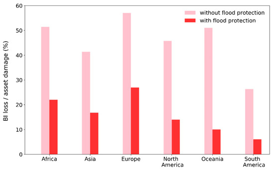 Ratio of BI loss to asset damage for each continent, with and without flood protection. Data are derived from annual averaged reanalysis simulation values.