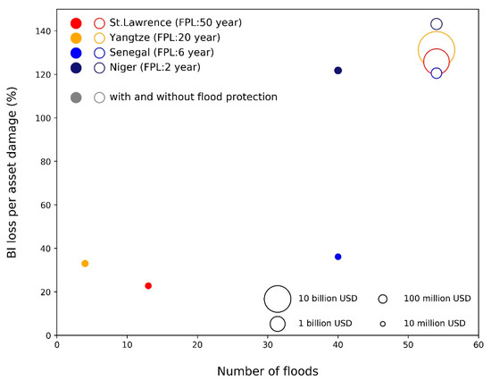 To test this hypothesis, we targeted four river basins whose ratios of BI loss to asset damage were similar without flood protection (ca. 130%) but different with flood protection. Figure 8 shows the relationship between the ratio of BI loss to asset damage and the number of floods in targeted river basins (Yangtze, St. Lawrence, Senegal, and Niger). We defined the number of floods as the number of years in which the calculated annual maximum inundation depth exceeded the flood protection of the region at least once. The number of floods and the ratio of BI loss to asset damage were slightly lower in river basins with low flood protection level (FPL). For example, in Niger (FPL, 2 years), the number of floods slightly decreased from 54 to 40 with flood protection, while the ratio of BI loss to asset damage remained nearly constant, shifting from 143.2% to 121.8%.
