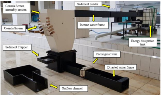 Intake structures are used to divert water from channels and river systems for various purposes, such as energy production, irrigation, and domestic use [1,2,3]. Tyrolean and Coanda types of water intake structures are the most widely used bottom intake structures in the world. No matter the type of intake, the expected purpose from any intake structure is to supply required water while filtering most of sediments and other unwanted particles as much as possible [4,5]. This is because energy production stages are carried out with different types of high-value machinery developed for working under clear water conditions. They are sensitive to sediment particles within water. In addition, sediment particles can become a shelter for various types of bacteria and protozoa and reduce sanitation efficiency, especially for ultraviolet disinfection operations [6]. In addition, heavy metals can become attached to particles, contaminating water in time. Therefore, water that is not purified well from sediment and other particles can cause important health problems.