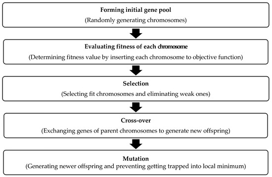 Genetic Algorithm is a nonlinear search and optimization method, inspired by biological processes of natural selection and survival of the fittest. GA has two main units as gene and chromosome. A gene consists of bits and a chromosome consists of genes. The gene represents a model parameter to be optimized and each chromosome stands for a solution candidate. In GA, the search process is initiated with many chromosomes. In each iteration, search space is scanned by the chromosomes, while the fitness evaluation, selection, pairing, crossover, and mutation operations are performed. Figure 4 shows the flowchart summarizing the GA operations. There are innumerous studies (papers and books) available in the literature, including [25], on the details of the GAs and their operations, and GA applications in water resources engineering.