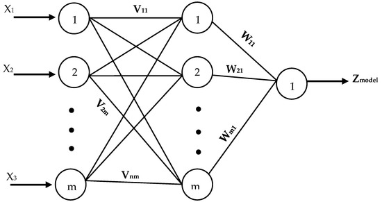 Figure 5 shows a typical commonly employed single hidden layer network where inputs (Xi) are passed on to neurons at the hidden layer as XiVij. These neurons, in turn, sum the weighted input as which is then transferred by a nonlinear transfer function (mostly, the sigmoid or the tangent hyperbolic function) to produce an output. This response can become an input for other neurons located in the next layer. This is continued until the network produces an output (Zmodel). The propagation from input to hidden to output neurons is called a forward pass.