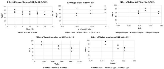 This study proposes nonlinear empirical equations for predicting WCP and SRE, based on the related dimensionless parameters presented in Table 4 and Table 5. As presented above, e/R is excluded from the WCP model after the multicollinearity analysis (see Table 4). Thus, the remaining parameters (ϴ, m, L/R, Froude, and Weber) are considered in the empirical equation for the WCP. However, another important issue is to decide the form of the equation, i.e., how to place each parameter (as numerator or denominator) with a positive exponent in the equation. To do so, the behavior (direct or inverse variation) between each parameter and the output variable, WCP, is analyzed. According to Figure 6, WCP varies directly with the void ratio (m) while it varies inversely with Weber number, Froude number, and the screen slope (ϴ). There is no clear relation observed between L/R and WCP. Therefore, the following nonlinear equation is proposed for WCP: