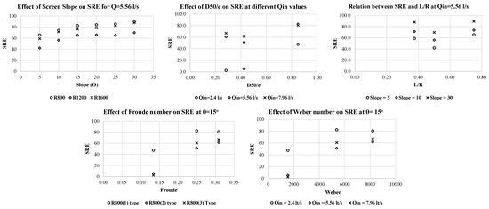 As presented above, m, D50/R, and e/R are excluded from the SRE empirical model after the multicollinearity analysis and therefore the remaining parameters, presented in Table 5 (ϴ, D50/e, Froude, Weber, and L/R), are considered in the empirical equation for the SRE. To decide the form of the equation, as it is presented above for the WCP, the behavior (direct or inverse variation) between each parameter and the output variable, SRE, is first analyzed. According to Figure 7, SRE varies directly with screen slope (ϴ), Froude, and Weber. There is no clear variation behavior observed for L/R and D50/e. Hence, the following nonlinear empirical equation is proposed for the SRE: