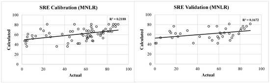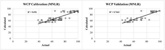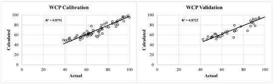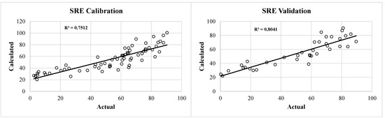 The same data used for the calibration of Equations (8) and (9) were employed for finding the coefficients and exponents of Equations (10) and (11). The obtained optimal values of the coefficients are presented in Table 8 and Table 9. Figure 10 and Figure 11 present the calibration and validation stages for WCP and SRE, respectively. The error measures related to these figures are summarized in Table 10.