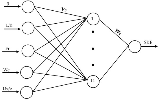 The ANN for the WCP has 5 neurons (input parameters: ϴ (angle), m (void ratio), L/R, Froude number, and Weber number) in the input layer, 11 neurons in the hidden layer, and a single output neuron for WCP (see Figure 12). The ANN of SRE contains 5 neurons (Input parameters: ϴ (angle), L/R, Froude number, Weber number, D50/e) in the input layer, 11 neurons in the hidden layer, and 1 output neuron for the SRE (see Figure 13). The networks were trained with 6000 epochs. The same data sets, which were randomly separated as about 70% for the calibration and 30% for the validation for the GA-based and MNLR empirical equations, were employed for the ANN training and testing stages, respectively.