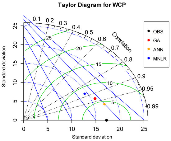 Summary of statistics of predicted WCP values by Taylor Diagram (black contours: Pearson correlation coefficient; green contours: centered RMSE; blue contours: standard deviation).