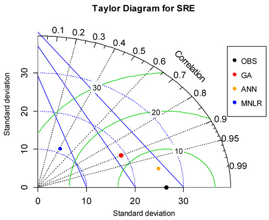 Summary of statistics of predicted SRE values by Taylor Diagram (black contours: Pearson correlation coefficient; green contours: centered RMSE; blue contours: standard deviation).