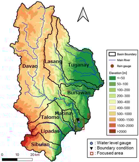 Eight river basins around Davao City, including the Davao River basin. The locations of rainfall gauges, water level gauges, boundary conditions, and the focus area are also shown.