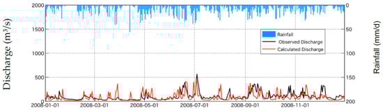 The basin-scale model employed the WEB-RRI model, a water and energy budget-based Rainfall-Runoff-Inundation model applicable to wet- and dry-climate river basins [22]. The model was calibrated by the river discharge of the annual simulation of 2002 at the Lacson station, the upstream water-level station. The model was also validated by the river discharge of the annual period and the biggest flood event of 2008, as shown in Figure 4 and Figure 5, respectively. Due to the low availability of long-term hydrometeorological gauge data, we employed satellite-based rainfall data, Climate Hazards Group InfraRed Precipitation with Station data (CHIRPS) [23], for calibration and validation. Although there are still challenges in calibration and validation because of the uncertainty of the rainfall data themselves, Figure 4 shows a reasonable agreement between the observed and simulated discharge. The event-based comparison provided in Figure 5 also shows rough agreement, though the Nash–Sutcliffe efficiency [24] is a modest value of 0.32. While the cause of this relatively low index value has not been clearly identified, it may be due to the insufficient reliability of the satellite-based rainfall input. The barangay-scale model employs the RRI model, which focuses on floods and simultaneously simulates rainfall-runoff and flood inundation processes on a 2-D basis at a river basin scale [25].