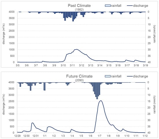 Results of river discharge at the upstream end of the focus area during the worst flood events for the past (upper) and future (lower) climate, simulated by the basin-scale model. The peak discharge in the future is about 2.5 times that of the past. These time series of river discharge were applied to the barangay-scale model as the boundary condition.