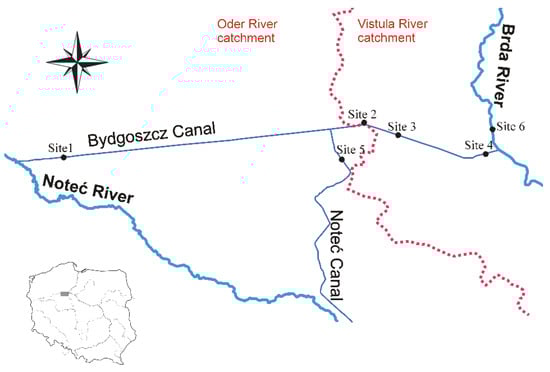 Map of investigated area. Bydgoszcz Canal: site 1—Józefinki in front of the sluice; site 2—Osowa Góra in front of the sluice; site 3—Prądy in front of the sluice; site 4—Okole behind the sluice; site 5—Noteć Canal in front of the sluice; site 6—Brda River.