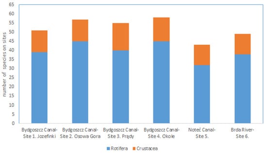 In total, we recorded 98 zooplankton species, including 73 rotifer species (i.e., 75% of all species) and 25 crustacean species (i.e., 25% of all species) alongside nauplii and copepodites, both of which are larval forms of Copepoda. The highest number of species in total was recorded at site 4 in the Bydgoszcz Canal (58), comprising 45 rotifer species and 13 crustacean species (Table 2, Figure 2). The lowest number of species (43) was recorded in the Noteć Cana at site 5, comprising 32 rotifer species and 11 crustacean species. The highest number of species in one sample (both rotifers and crustaceans) was 18, which was also recorded in the Bydgoszcz Canal, as compared to the 15 in the Noteć Canal and 14 in the Brda River. The highest total number of rotifer species was observed in the Bydgoszcz Canal at site 2 (45) and at site 4 (45), and the highest number of crustaceans at site 3 (15) (Table 2).
