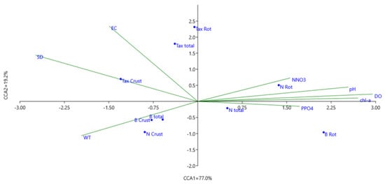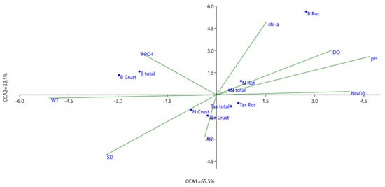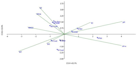 Results of canonical correspondence analysis (CCA) performed on zooplankton and environmental data during vegetation season in the Brda River using forward selection of variables (p < 0.05). Triplot of significant environmental variables (water temperature: WT, Secchi disk visibility: SD, conductivity: EC, oxygen concentration: DO, pH, chlorophyll: chl-a, nitrate: NNO3−, phosphate: PPO42−), number of zooplankton species (Tax total, Tax Rot, Tax Crust), zooplankton density (N total, N Rot, N Crust), and zooplankton biomass (B total, B Rot, B Crust).