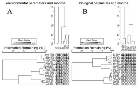 Two-way cluster analysis was used to select between environmental parameters at the studied sites during the growing season (Figure 6A). The dendrogram showed a good division between sites based on water temperature, pH, and conductivity. Within the studied sites and months, the cluster analysis characterized a high correlation between the Noteć Canal, the Bydgoszcz Canal, and the Brda River in spring months. The cluster analysis showed differences between the Brda River and both studied canals in summer and autumn. Meanwhile, at the same time (summer and autumn), the correlation between the Bydgoszcz Canal and the Noteć Canal was observed (Figure 6A). Two-way cluster analysis also compared the selected biological parameters (zooplankton data) at the studied sites during the growing season (Figure 6B). The dendrogram showed a good division between sites within individual months based on average zooplankton density, rotifers density, and biomass. The basic division distinguished two groups. The first group comprised autumn and summer samples primarily from the Noteć Canal and Brda River, and the second group comprised samples from the Bydgoszcz Canal sites prevailing during spring, summer, and autumn. This division indicated the greatest differentiation of zooplankton in the Bydgoszcz Canal, e.g., the largest number of samples (September and August) was outside the groups consisting mainly of samples from spring, summer, and autumn (Figure 6B).